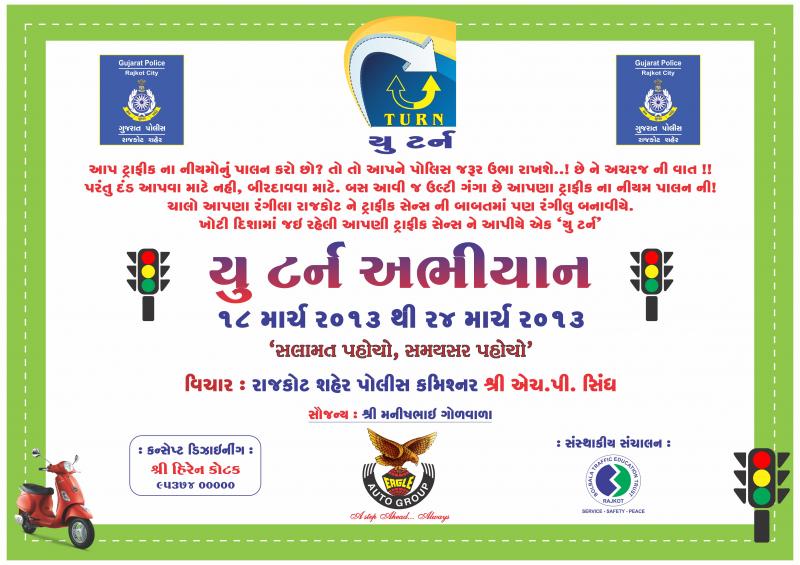 U TURN aims to bring out the problems in our traffic sense and create awareness about the ill effects of driving in anger or with a general lackadaisical attitude. We need to look at the bigger picture here and make some serious changes. For this purpose we expect full support of the media so that our voices are heard in each and every household of Rajkot.